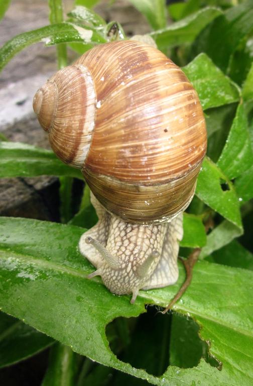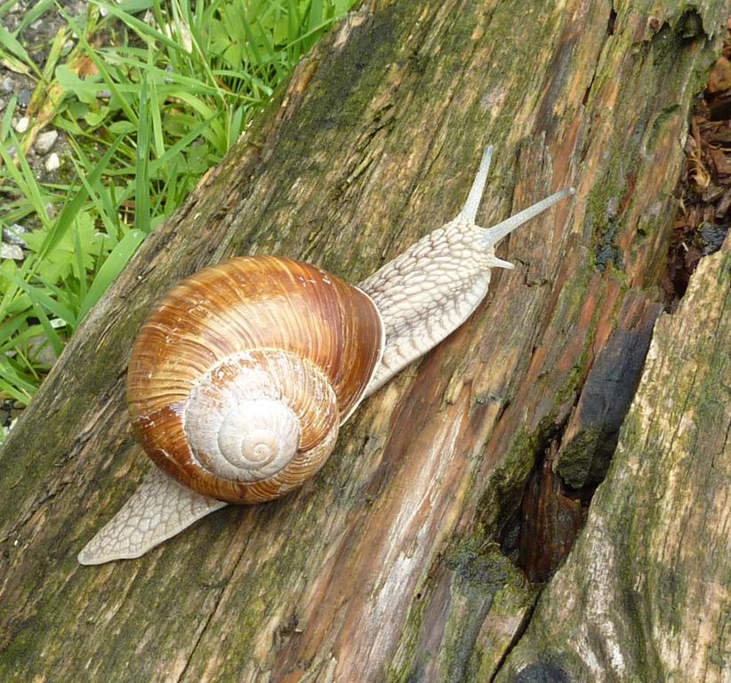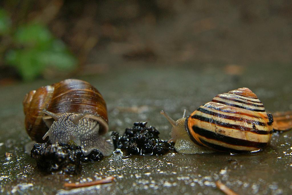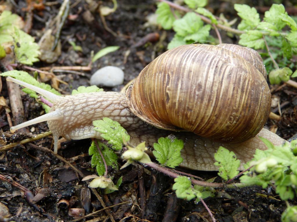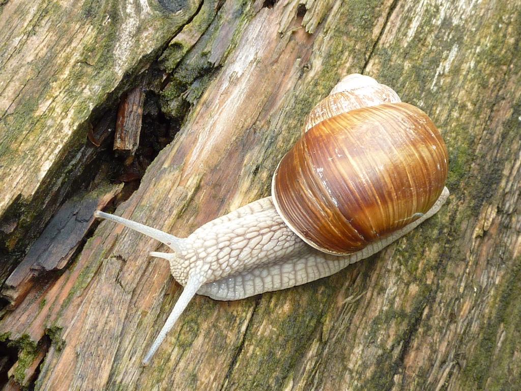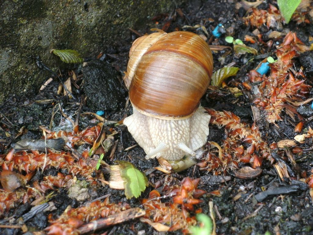 Bei den fotografierten Tieren handelt es sich um insgesamt fünf verschiedene Arten, vier davon sind wohl jedem bekannt: Weinbergschnecke (Helix pomatia), Hain-Bänderschnecke oder "Schnirkelschnecke" (Cepaea nemoralis, dunkle Mündung), die ähnliche Garten-Bänderschnecke (Cepaea hortensis mit einer hellen Mündung) und Rote Wegschnecke (Arion rufus). Zwei Fotos (Schmidt) zeigen die etwas seltenere und aus dem Süden eingewanderte Gefleckte Weinbergschnecke (Cornu aspersum).