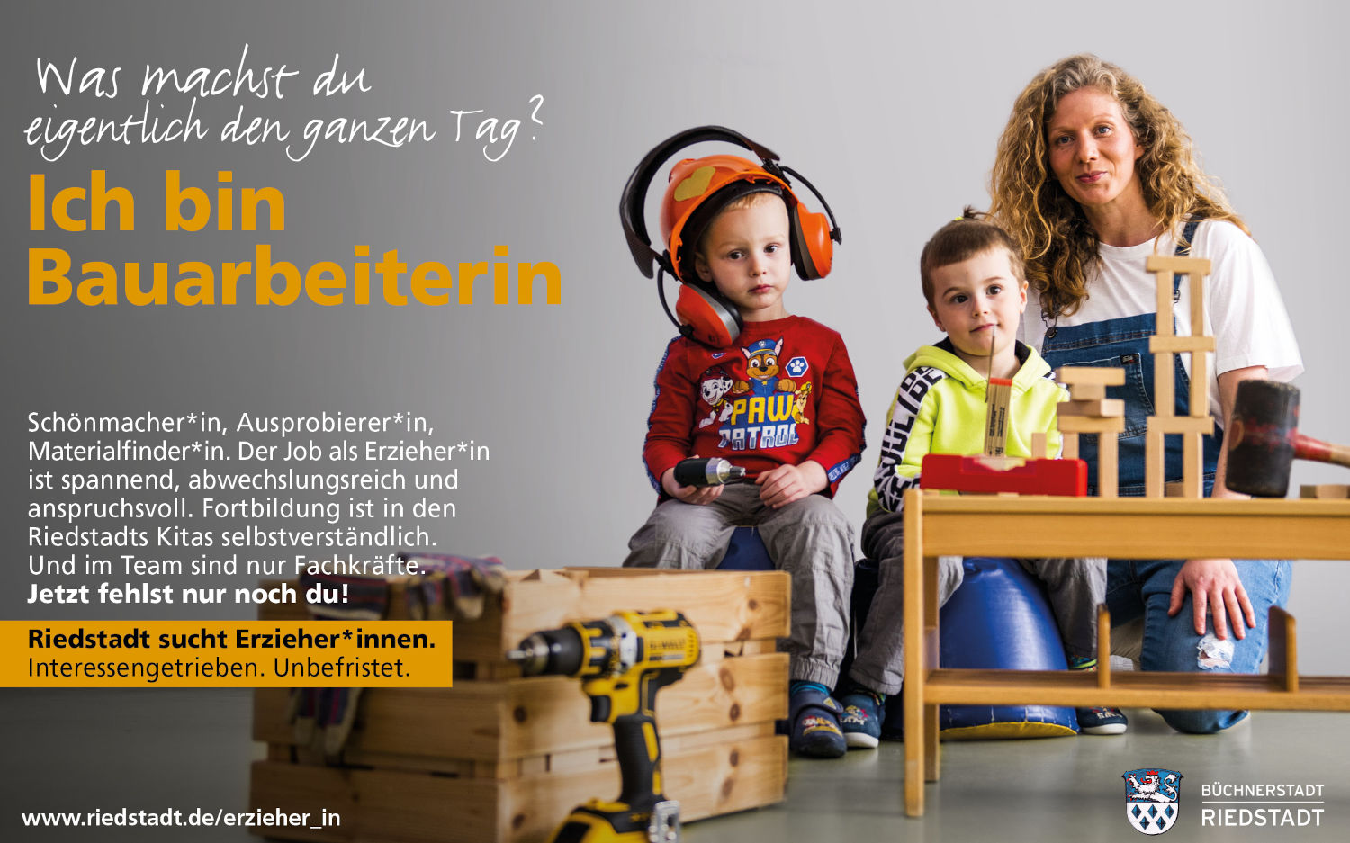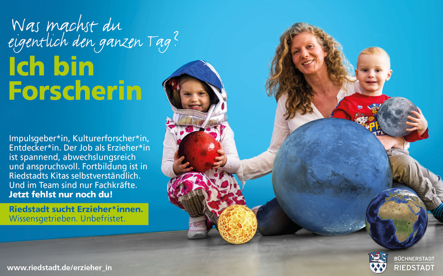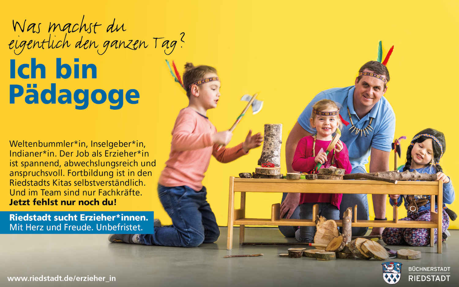 Riedstadt sucht Erzieher*innen. In der Büchnerstadt Riedstadt gibt es eine lebendige Kita-Kultur. Da die Stadt mit den vielen Neubaugebieten auch den großen Bedarf an Kinderbetreung decken muss, suchen wir momentan für unsere 14 Kitas Fachkolleginnen und -kollegen für die Teams.