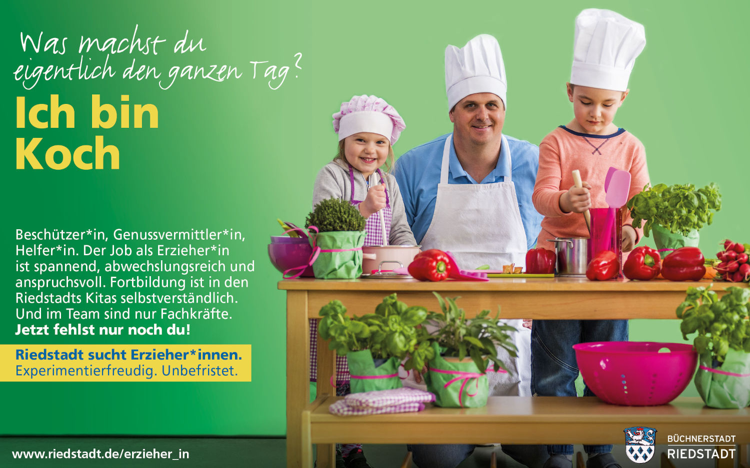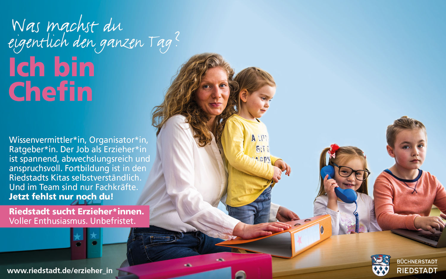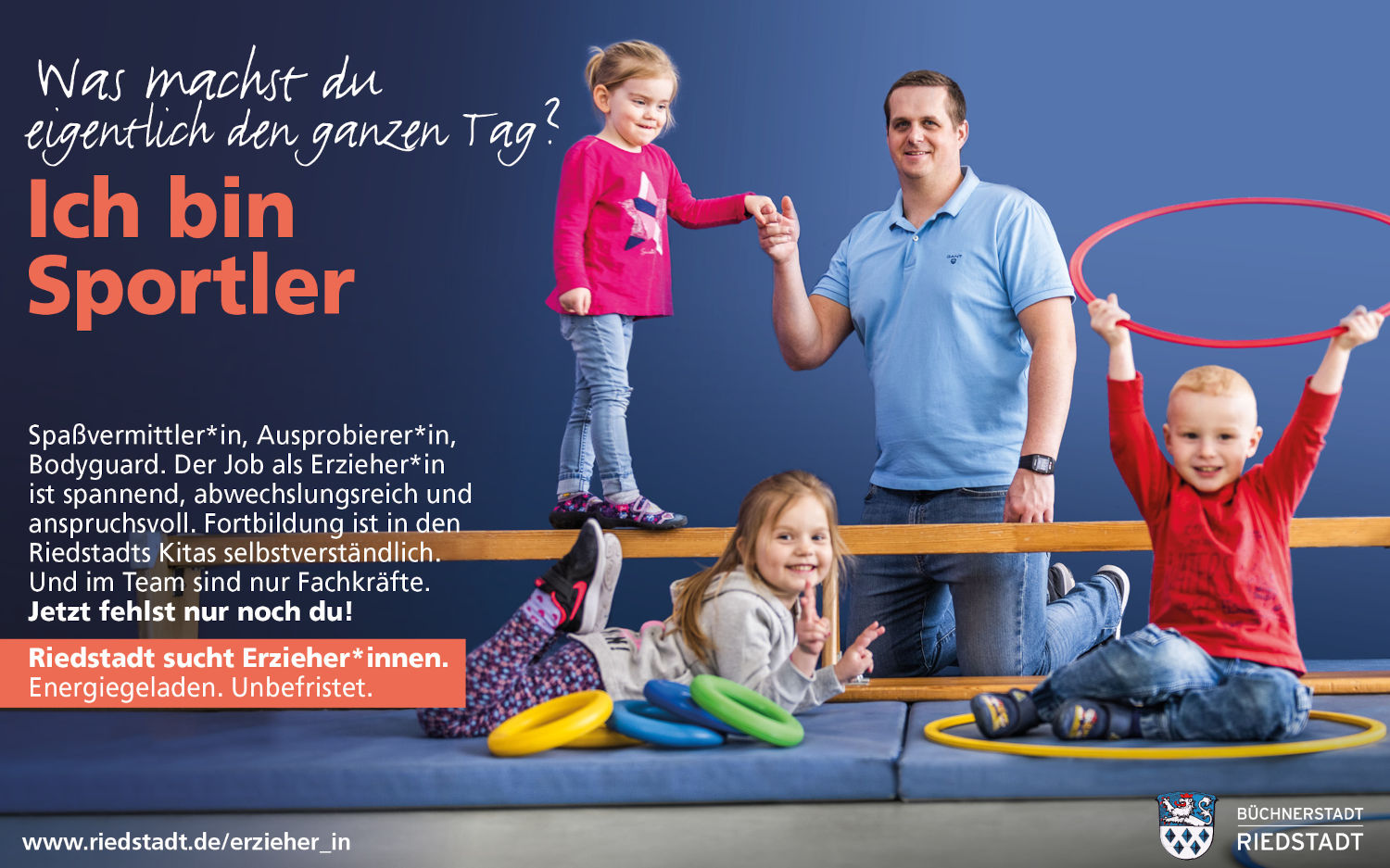 Riedstadt sucht Erzieher*innen. In der Büchnerstadt Riedstadt gibt es eine lebendige Kita-Kultur. Da die Stadt mit den vielen Neubaugebieten auch den großen Bedarf an Kinderbetreung decken muss, suchen wir momentan für unsere 14 Kitas Fachkolleginnen und -kollegen für die Teams.