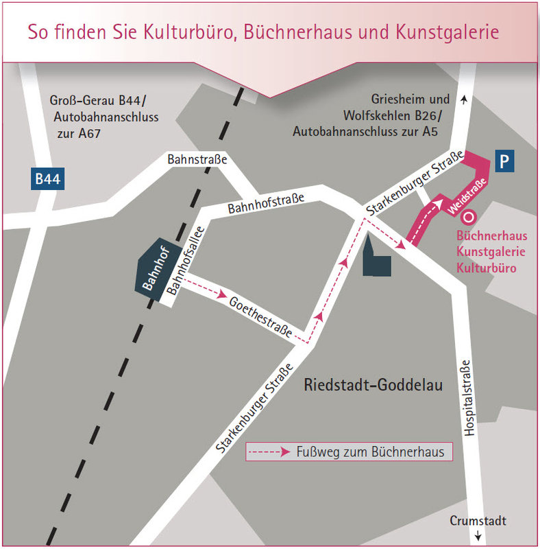 Die Endstation Ihrer Anreise per Bahn ist der Bahnhof Riedstadt-Goddelau. Eine Skizze über den Fußweg vom Bahnhof zum Büchnerhaus finden Sie hier.