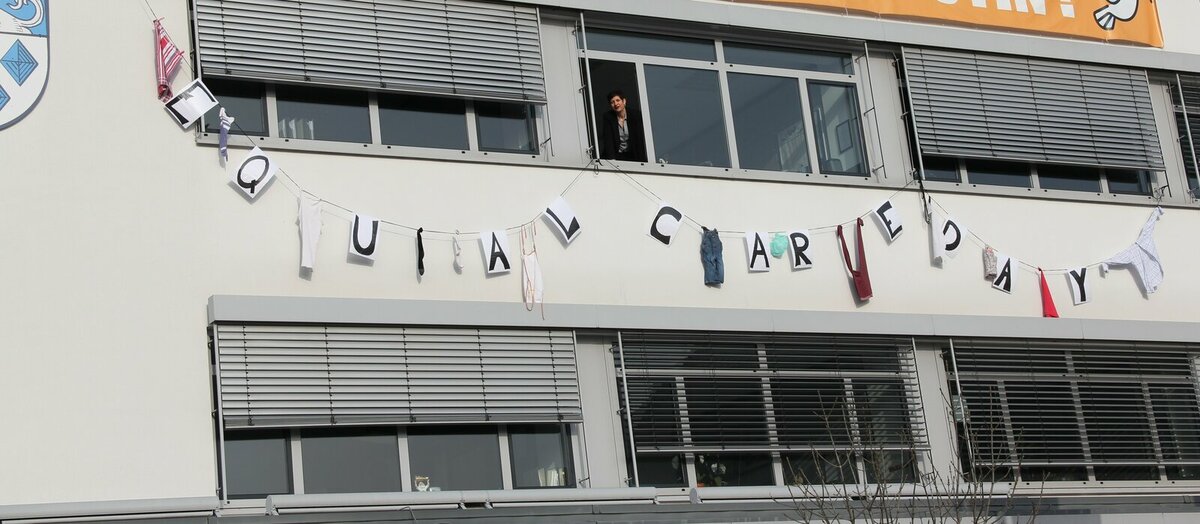 Eine Wäscheleine mit Tüchern, Hemden, Kinderkleidung und Ähnlichem hat die Riedstädter Frauen- und Gleichstellungsbeauftragte Jennifer Muth am Donnerstag, 29. Februar am Riedstädter Rathaus aufgespannt. Damit möchte sie auf den Equal Care Day hinweisen. „Der Aktionstag soll auf die mangelnde Wertschätzung und unfaire Verteilung von Fürsorgearbeit aufmerksam machen und nimmt die unbezahlte Sorgearbeit in den Blick, der in den Familien und im Ehrenamt erbracht wird“, erläutert Muth.