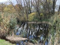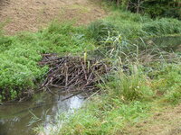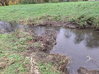 Vor etwa zwei Jahren hat sich dort auch ein Biber angesiedelt, was die Naturnähe und hohe Qualität der dort entstandenen Landschaft unterstreicht. Im September 2024 nun baute der Biber erstmals einen typischen Biberdamm und zwar genau dort, wo der renaturierte Bereich wieder in das Regelprofil, also den technisch verbauten Bachbereich ab etwa Höhe Ostrand Tennisplätze Crumstadt, übergeht. Damit hat das kluge Tier bei minimalem Aufwand – dort ist der Bach wieder sehr schmal – einen maximalen Effekt erzielt und den bachaufwärts liegenden Bereich bis zu etwa einem Meter hoch eingestaut.