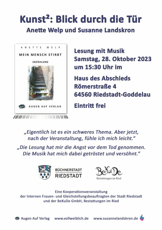 „Was bleibt, ist die Seele. Sie ist unsichtbar. Wir können sie spüren. Ein Vogelgezwitscher, eine Berührung, eine Stimme, ein Sonnenstrahl im Gesicht.“ So beginnt das Büchlein „Mein Mensch stirbt“ von Anette Welp. Am Samstag, 28. Oktober wird sie um im Haus des Abschieds in Riedstadt-Goddelau, Römerstraße 4, daraus lesen, begleitet von Susanne Landskron am Klavier.