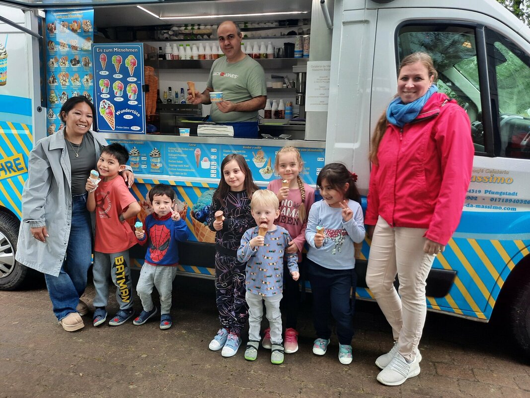Eine schöne Überraschung erlebten die Kinder der Kita Pfiffikus: Der Elternbeirat hatte ein Eismobil des Eiscafés Gelateria Da Massimo gesponsert, das vor der Kita Station machte. Jedes Kind konnte sich eine Kugel Eis mit Streuseln aussuchen, wahlweise in der Waffel oder im Becher.