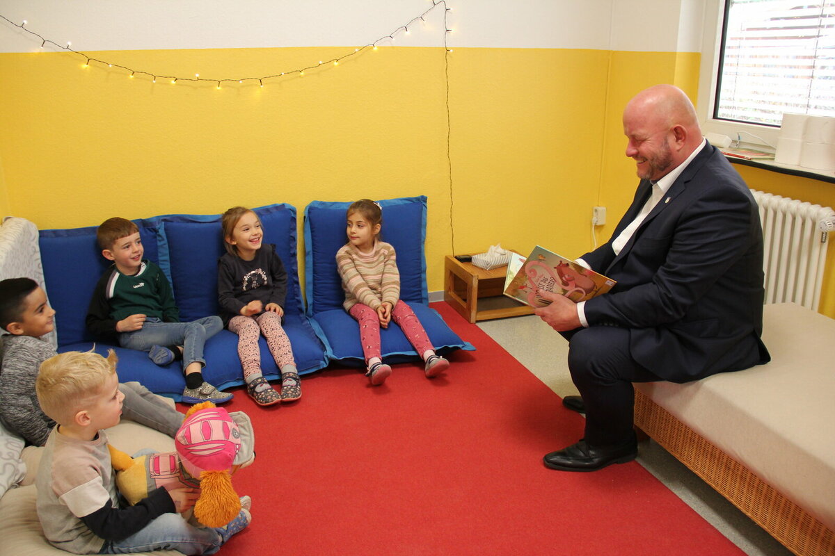 Das zwar nicht, aber dafür liest er hin und wieder vor. Der Bürgermeister ist mit dem Ersten Stadtrat zum bundesweiten Vorlesetag in die Kita gekommen. Die Kinder sind bestens vorbereitet, erzählt Kitaleiterin Nora Lerch: Jedes Kind konnte sich vorab eines der vier Bilderbücher aussuchen, aus denen die beiden Stadtrepräsentanten heute vorlesen, sodass jedes in den Genuss des Vorlesevergnügens kommt.