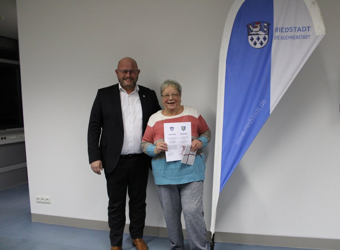 Eine ganz besondere Urkunde erhielt Ehrenstadträtin Erika Zettel bei der jüngsten Sitzung des Arbeitskreises Verschwisterung aus den Händen von Bürgermeister Marcus Kretschmann. In Anerkennung und als Dank für das besondere Engagement und fünf Jahrzehnte herausragenden Einsatz für die Städtepartnerschaft zwischen der Büchnerstadt Riedstadt und Brienne-le-Château und seiner Region wurde sie mit der zweisprachigen Auszeichnung geehrt.