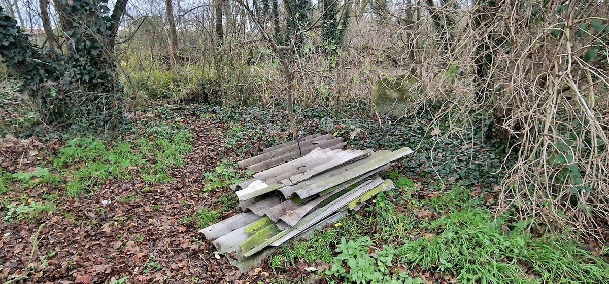 Mitarbeitende des Bauhofs fanden am 2. Januar vermutlich asbesthaltige Dachwellplatten direkt am Parkplatz am Leeheimer Friedhof. Mehrere Wellplatten wurden hier wahrscheinlich über die Feiertage illegal entsorgt.