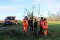 Je Baum spendete der Naturfreund 100 Euro. Die Fachgruppe Umwelt schaffte davon fünf Apfel-Hochstämme alter regionaler Sorten an und organisierte die Pflanzaktion durch den städtischen Bauhof. „So viel Engagement freut uns natürlich sehr, insbesondere angesichts der angespannten Haushaltslage“, sagt Fachgruppenleiter Umwelt Holger Schanz. Er ist mit Außendienstler Gerry Assmann zur Pflanzaktion an die Stelle südlich vom Scheidgraben gekommen. Dort heben Maria Botezatu, Detlef Warren und Elvir Sutic vom Bauhof Löcher in einer Reihe vor und hinter den beiden alten, stattlichen Rheinischen Bohnäpfeln und pflanzen eine Champagner Renette, einen Heuchelheimer Schneeapfel, eine Landsberger Renette, eine Rheinische Schafsnase und einen weiteren Rheinischen Bohnapfel.