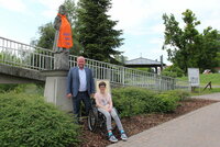 Bei der breit angelegten Kooperationsveranstaltung von Kulturbüro und Behindertenbeauftragten mit dem SV Crumstadt, den Riedstädter Ortsverbänden des Sozialverbands VdK, des Kreises Groß-Gerau, des Landesverbandes Hessen der Deutschen Multiple Sklerose Gesellschaft (dmsg) und der ÜWG hatte der Geschäftsführer des Landesverbandes Hessen der dmsg, Benno Rehn, den Schal überreicht mit der Bitte, damit auf den Welt-MS-Tag am 30. Mai aufmerksam zu machen. „Dieser Bitte kommen wir sehr gerne nach, um auf diese unheilbare Krankheit aufmerksam zu machen“, erklärte Bürgermeister Marcus Kretschmann beim Ortstermin mit Wohner.