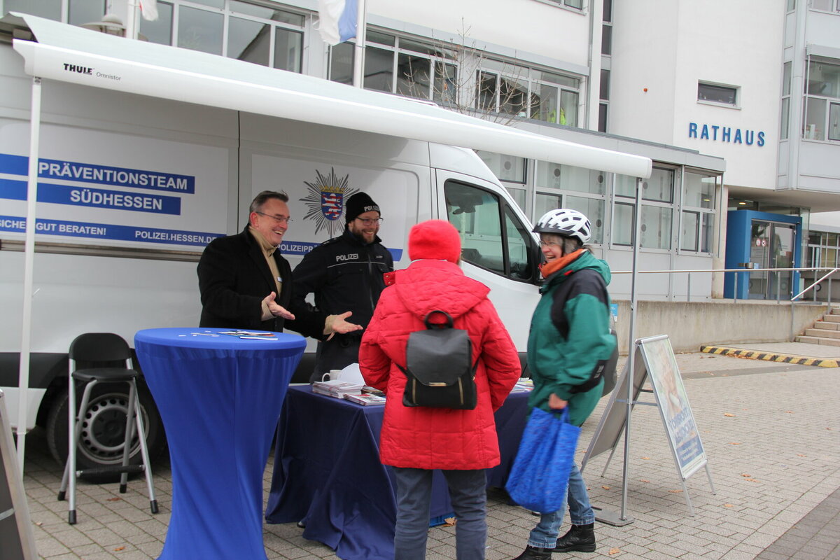 Zur Eröffnung hatte die Stadtpolizei ihr Fahrzeug sowie das mobile und das semistationäre Messgerät zur Geschwindigkeitsmessung, den sogenannten „Blitzanhänger“ auf dem Rathausplatz ausgestellt. Zeitgleich veranstaltete die Polizei vor der Verwaltungszentrale einen Informationstag. Marcel Aldorf vom Präventionsteam Südhessen beriet zum Thema Einbruchsschutz und sein Kollege Michael Rühl über Cyberkriminalität. Rege genutzt wurde zudem die Möglichkeit, bei den Schutzfrauen vor Ort Katja Vagi-Mager und Caroline Fernandez Fahrräder registrieren zu lassen.