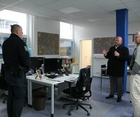 Einen Eindruck von den neuen Räumlichkeiten konnten sich im Anschluss die Besucher*innen der Eröffnung machen. Hinter dem Eingangsbereich mit Empfangstheke gelangt man in das helle Großraumbüro der vier Stadtpolizisten, direkt daneben hat Frank Schaffner, Leiter der städtischen Verkehrsbehörde und stellvertretender Fachbereichsleiter Öffentliche Sicherheit und Ordnung, sein Büro. Zudem gibt es eine Teeküche sowie Sanitätsräume.