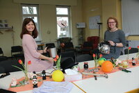 Auf dem liebevoll dekorierten langen Tisch im Saal der Stiftung Soziale Gemeinschaft Riedstadt liegen Dinge, die auf den ersten Blick nicht viel miteinander zu tun haben: So zum Beispiel ein Hammer mit deutlichen Gebrauchsspuren, ein schwarzer Hut, den der traditionelle Gass-Kehrer beim Erfelder Kerweumzug trägt und ein Handball. Gut gelaunt präsentiert Nicole Novak dazu einen modernen Wasserkocher und Melanie Stahlecker-Zach das Gegenstück in Form eines alten Teekessels.