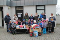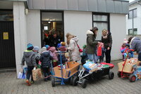 „Vielen lieben Dank – da freuen sich die Kinder, deren Eltern nicht so viel Geld haben“, begrüßt Bau die Kinder vor der Tür der Kleiderkammer, bevor diese mit Begeisterung ans Abladen gehen. Sie bringen Bau die Tüten, auf denen vermerkt ist, für welches Alter die Gaben geeignet sind: eins bis drei Jahre oder vier bis sechs Jahre. Dann ziehen die jungen Gabenbringer mit leichten Bollerwagen wieder zurück in die Kita Sonnenschein.