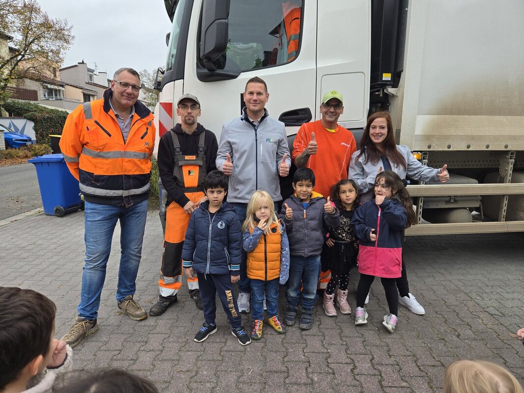 Nun kam das Highlight; die Müllabfuhr! Die Mitarbeiter der Firma Meinhardt zeigten den aufgeregten Kids wie das Müllauto funktioniert und wie Tonnen richtig geleert werden. Im Anschluss durften die Kinder auf das Trittbrett steigen, um mal ganz nah beim Müllauto zu sein. Die ganz Mutigen (in diesem Fall alle) durften auch ins Führerhaus klettern und einmal kräftig Hupen. Mit einem lauten Dankeschön verabschiedeten die Kleinen das Müllwerker Team der Firma Meinhardt.