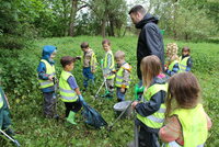 Kinder eines Naturkindergartens gehen natürlich raus in die Natur – das ist auch am „Sauberhaften Kindertag“ so. Ausgestattet mit Müllzangen, Müllsack und Plastikeimern suchen die jungen Naturfreunde nicht nur die Wege rund um den Naturkindergarten An der Sandkaute in Riedstadt-Wolfskehlen ab, sondern auch Wiesen und Wäldchen abseits der Wege. Und sie werden fündig: Mit vereinten Kräften ziehen sie sogar eine große blaue Plastiktüte aus dem Boden. Da staunt auch Fachbereichsleiter Kinder, Jugend und Soziales Rick Hölzer, der zum Aktionstag vorbeigekommen ist.