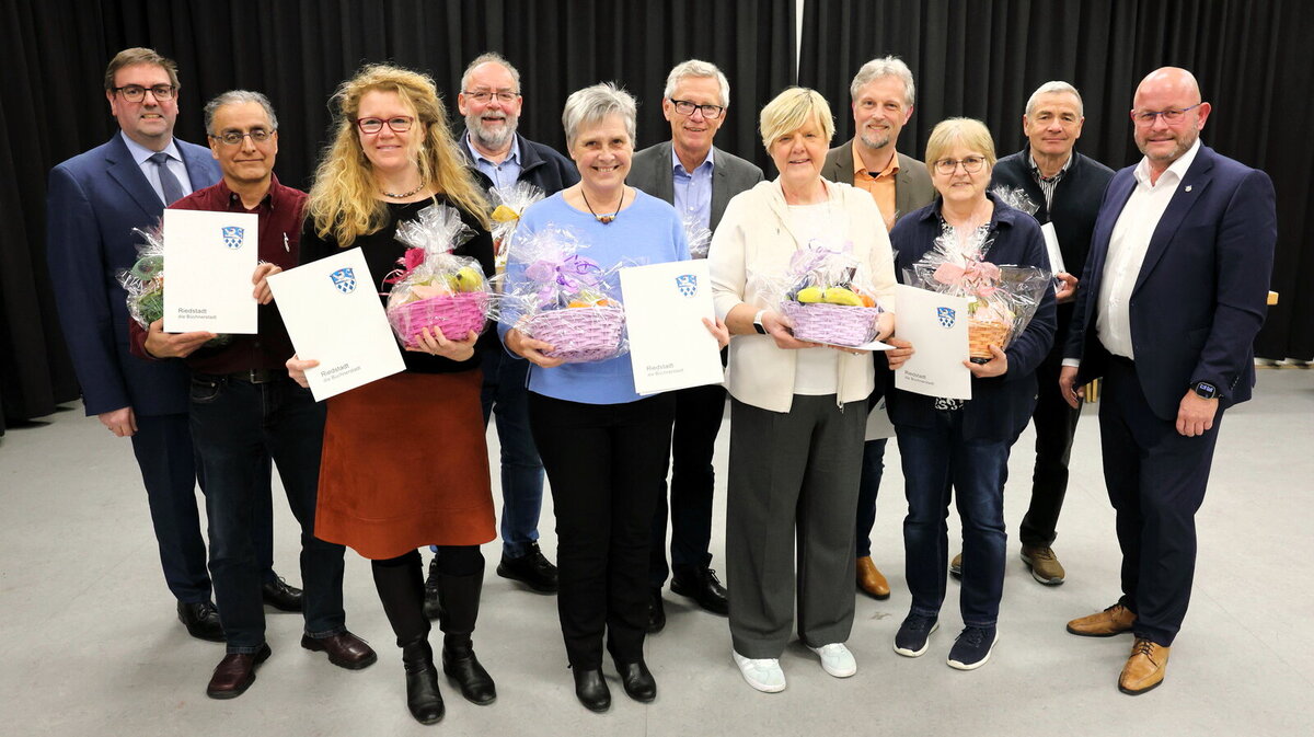 Richtig voll wurde es auf der Bühne bei der Verleihung der Ehrenbriefe: Für mindestens zehn Jahre ehrenamtliche Tätigkeit in kommunalpolitischen Gremien erhielten die Auszeichnung Bärbel Fischer, Gaston Wolfsturm (beide CDU), Wilfried Büdinger, Samer Chawaf, Gerald Kummer, Reginal Plettrichs und Melanie Stahlecker-Zach (alle SPD), Sebastian Wispel und Carola Friedrich (beide Grüne) sowie Ahmed Naseer (Ausländerbeirat). Eigentlich hätten auch Karl Angelé (FW) und Norman Kalteyer (Linke) Ehrenbriefe verdient, merkte Bürgermeister Kretschmann an, „aber leider haben sie schon Ehrenbriefe.“