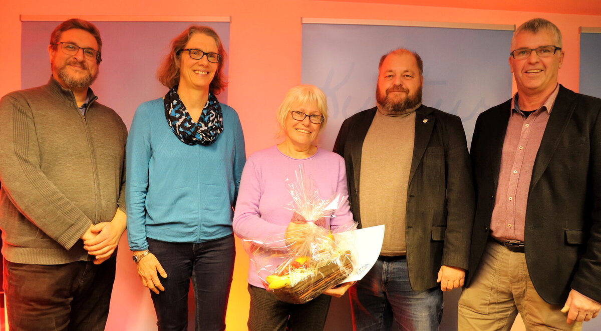 Eine davon bat er zu ihrer völligen Überraschung nach oben auf die Bühne: Bärbel Schmidt betreut seit zehn Jahren mit großem Engagement die Ausleihe in Leeheim, hatte aber auch Vertretungseinsätze in den anderen Stadtteilbüchereien. Sie „kennt die Lesevorlieben der Leserinnen und Leser sehr genau und gibt immer gerne entsprechende Leseempfehlungen. Bei Bedarf beliefert sie ältere oder erkrankte Leserinnen und Leser auch mit Büchern“, hatte Büchereileiterin Anja Stark in ihrem Antrag geschrieben. Für diesen großen Einsatz verlieh der Erste Stadtrat Ottmar Eberling in Vertretung von Bürgermeister Marcus Kretschmann Bärbel Schmidt den Ehrenbrief der Büchnerstadt Riedstadt.