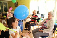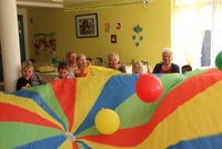 Diese Begeisterung ist einfach ansteckend: lauthals lachend freuen sich zehn Kinder der Kita Am Park über wild hüpfende Bälle und Luftballons. Das zaubert auch Bewohnerinnen und Bewohnern des Seniorenhauses am Park ein Lächeln ins Gesicht. Zehn junge und zehn alte Händepaare halten den Rand eines riesigen, knallbunten Schwungtuches und bringen durch kräftige Auf- und Ab-Bewegungen Bälle und Ballons zum Hüpfen. Die Kleinen stehen, die Großen sitzen, eine von ihnen im Rollstuhl. Doch das ist völlig egal. Denn hier steht das gemeinsame Tun im Vordergrund.