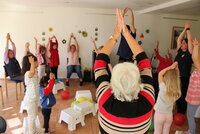 Zum Abschluss darf jeder einen großen Stoffwürfel werfen. Je nachdem, welche Seite oben liegt, müssen alle ihr Gesicht zum Zitronengesicht verziehen, die „Blumenatmung“ praktizieren oder ganz steif stehen wie ein Berg. Beliebt ist auch das Fragezeichen, bei dem eine Aktivität frei gewählt werden kann und jeweils die Entscheidung aufs Singen fällt. Besonders die alten Menschen haben daran große Freude.