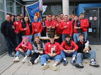 Stimmgewaltig singend und ihre Fahne schwenkend zogen die Goller Kerweborsch am Kerwemontag zu ihrem traditionellen Empfang vor das Riedstädter Rathaus. Angesichts des guten Wetters marschierten sie nicht wie sonst die drei Stockwerke hoch in den Sitzungssaal, sondern machten es sich mit einem Fässchen Bier vor der Verwaltungszentrale gemütlich.