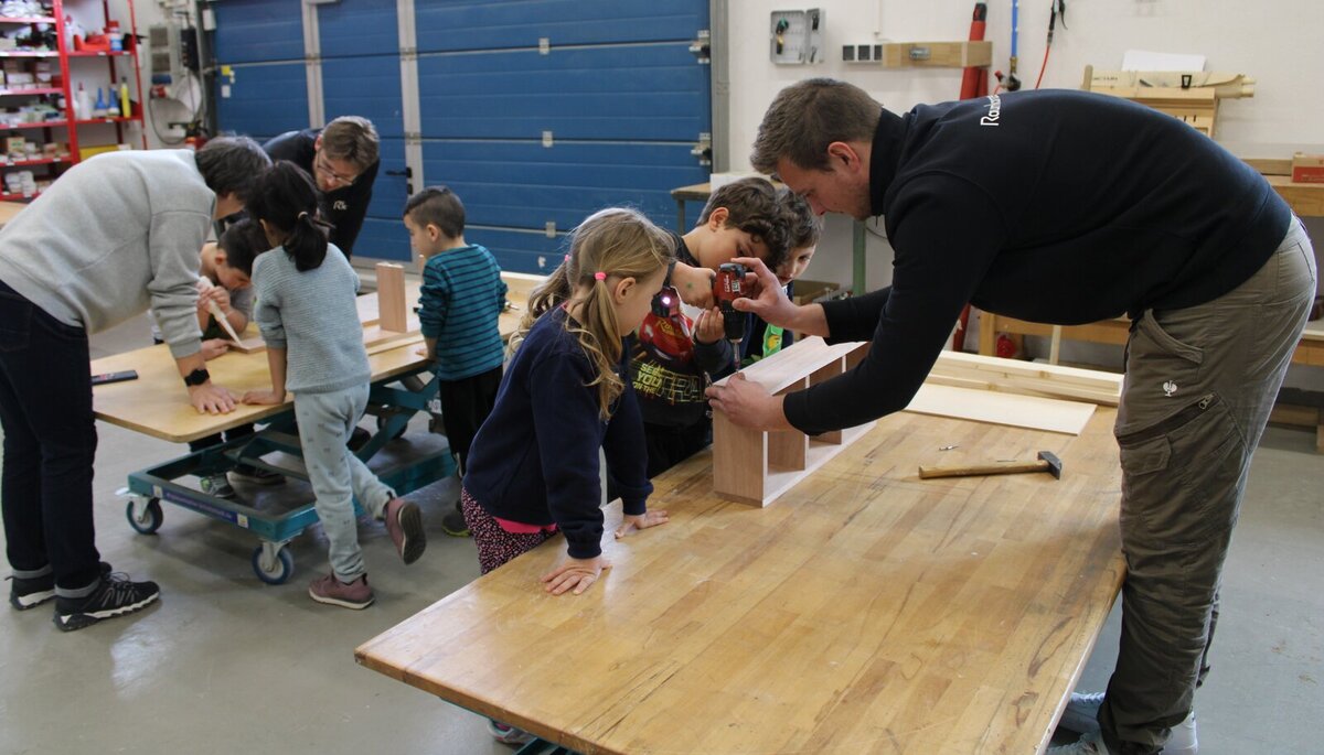 Was für ein ungewöhnlicher Anblick: Inmitten der Schreinerei der „Raumkonzept plus GmbH“ in Riedstadt-Goddelau stehen 15 Kitakinder an vier Tischen und werkeln gemeinsam mit den Profis. Die Kita Büchnerstraße nimmt mit der Schreinerei an dem Kita-Wettbewerb „Kleine Hände, große Zukunft“ der Aktion Modernes Handwerk (AMH) teil. Die Kreishandwerkerschaft Groß-Gerau hatte die Goddelauer Kita auf den Wettbewerb aufmerksam gemacht und Kitaleiterin Nora Lerch und ihr Stellvertreter Andre Wasser waren begeistert von der Idee, gemeinsam mit Raumkonzept plus den Kindern zu zeigen, wie spannend Handwerksberufe sind.