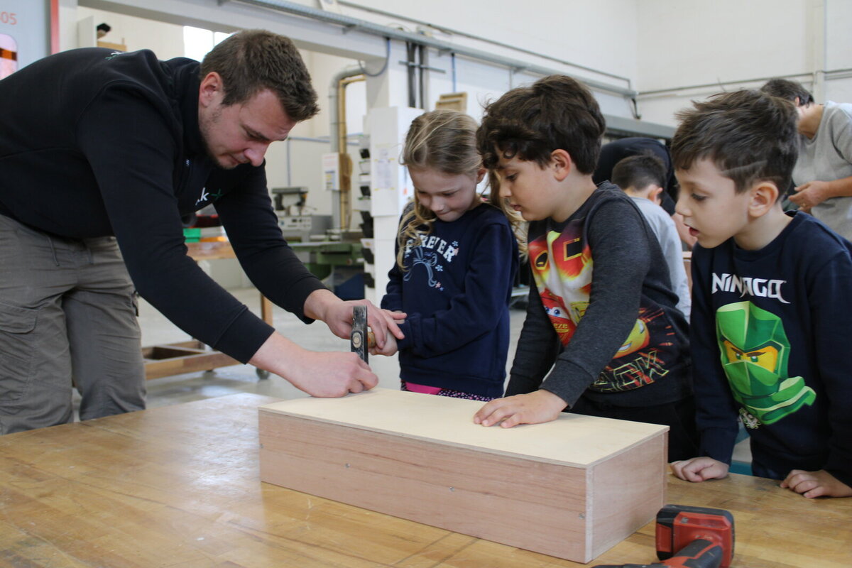 So marschieren an einem Märzvormittag 15 Kitakinder mit Lerch und Wasser sowie Erzieherin Monika Marinovic von der Kita Büchnerstraße rüber ins Gewerbegebiet Im Entenbad und werden in der großen Halle der Schreinerei begrüßt von André Lindemann, Fachleiter Schreinerei, Schreinergeselle Yannis Bracher und Azubi Marco Vollrath.