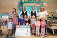 Neun Kinder der Kita Sonnenschein im Alter von drei bis sechs Jahren besuchten mit der stellvertretenden Leiterin Francesca Vulpetti und Erzieherin Jennifer Wagner Timo Müller, Marktleiter im Rewe-Markt in Erfelden und seinen Stellvertreter Jan Riedinger. Im Einkaufsmarkt erhielt die Gruppe nicht nur einen symbolischen Scheck über 750 Euro, sondern wurde auch noch mit erfrischenden Getränken und Süßigkeiten versorgt.