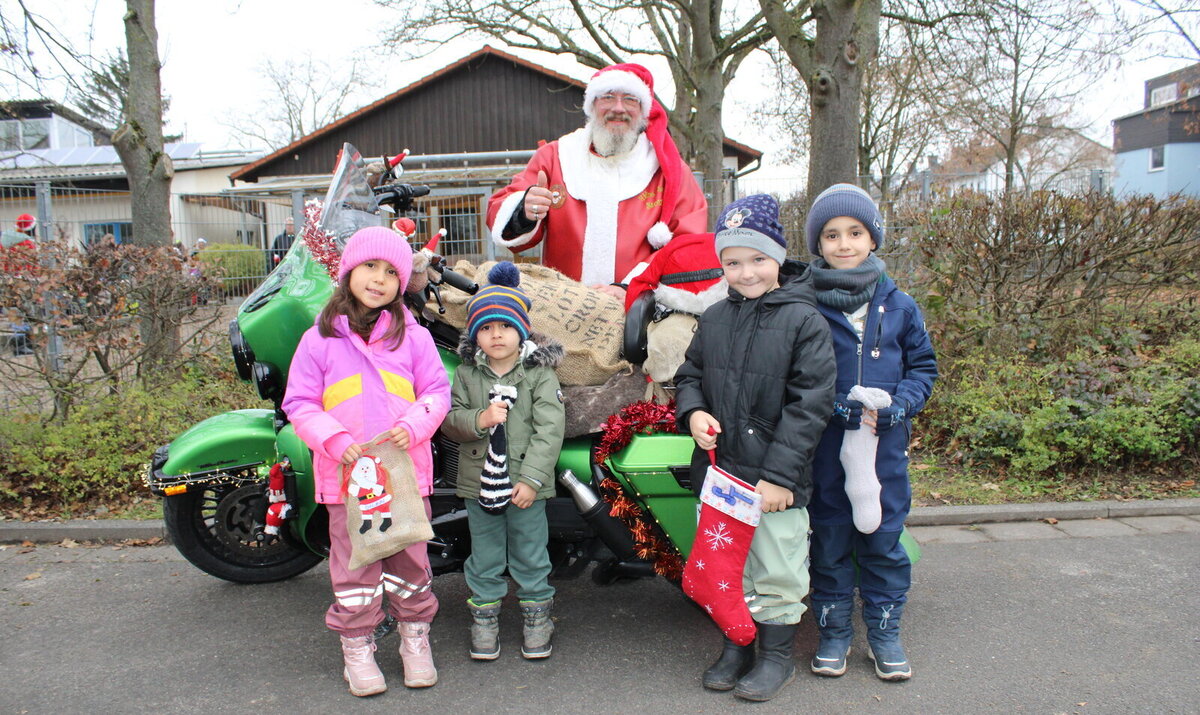 Der motorisierte Nikolaus hört im bürgerlichen Leben auf den Namen Frank Steinbrech und sammelt als Mitglied der privaten Motorradgruppe „Riding Santas Südhessen“ in der Vorweihnachtszeit Spenden für das Kinder-Palliativ-Team Südhessen. „Ich mache das jetzt seit 2019. Mir war es wichtig, dass ich weiß, wohin die Spenden gehen und wofür sie genau verwendet werden. Alle Spenden gehen zu hundert Prozent an das Kinder-Palliativ-Team“, erzählt er. Der Elternbeirat war auf den Motorrad-Nikolaus aufmerksam geworden und hatte die Spendenaktion vorgeschlagen. Bereits im Vorfeld lagen in der Kita Flyer mit Infos aus und so konnte der Nikolaus nach der Geschenkausgabe eine gut gefüllte Spendendose im Gepäck seines Motorrads verstauen und wieder davonbrausen.