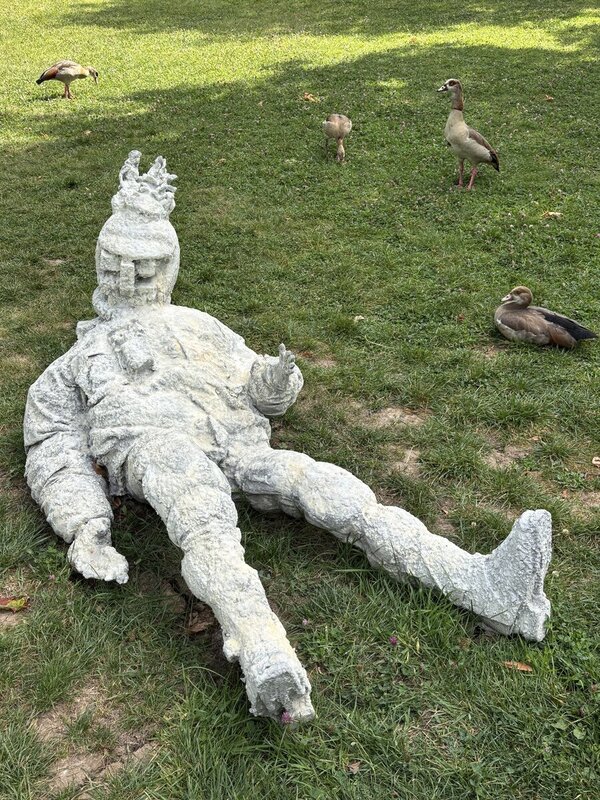 Nach der rund eineinhalb Stunden dauernden Führung konnten die Paten und Patinnen dann den weiteren Tagesablauf frei gestalten, wobei bei den meisten zunächst eine Einkehr in eines der dortigen Lokale zur Stärkung anstand. Im circa zehn Minuten fußläufig vom Schlosspark entfernten Kurpark waren weitere 24 Skulpturen zu entdecken, darunter das kleinste und gleichzeitig aber auch größte Kunstwerk: Unweit des Schwanensees ist dort auf einem unscheinbaren Schild zu lesen: “From may 18 to octobre 4 every crow in the city of bad homburg will be considered as a sculpture“. Der amerikanische Künstler David Horvitz erklärt damit für den Zeitraum der Ausstellung alle Krähen in Bad Homburg zu einem Kunstwerk – der Rest findet in den Köpfen der Besucher und Besucherinnen statt.