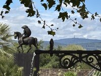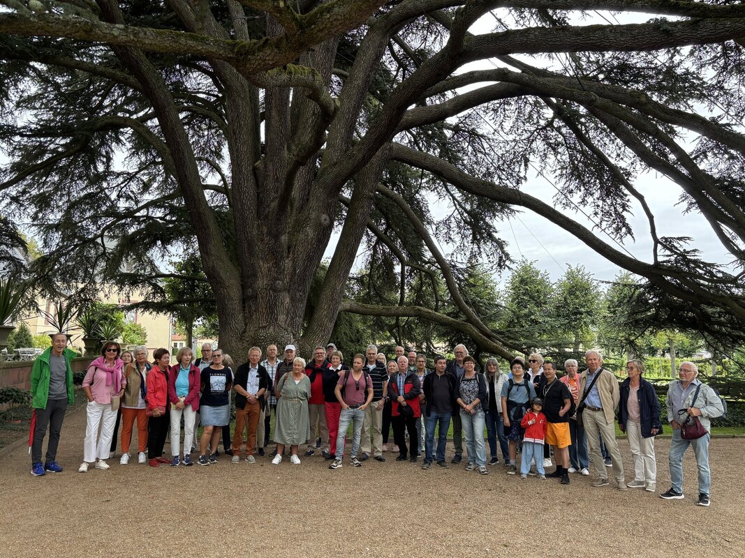Die rund 60 Riedstädter Besucherinnen und Besucher sammelten sich nach ruhiger Anfahrt mit dem Reisebus zunächst unter der riesigen, 1822 gepflanzten Atlas-Zeder vor dem Eingang zum Bad Homburger Schloss. Dort wurden sie von zwei Führerinnen der Blickachsen in Empfang genommen, die dann die in zwei kleinere Gruppen aufgeteilten Pflegepatinnen und –paten durch den Schlosspark führten und dabei die dort ausgestellten acht Skulpturen sehr fachkundig und lebendig erläuterten. Zudem gab es Hintergrundinformationen über die Geschichte des Parks und des Schlosses.