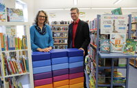 Fröhlich bunte Sitzkissen stapeln sich in Farbschattierungen von gelb und orange bis lila und blau einladend in der Bücherei Erfelden. Gedacht sind sie vor allem für die beliebten (Vor-)Leseveranstaltungen der Stadtbücherei. Bisher mussten diese unter erschwerten räumlichen Bedingungen stattfinden, wegen des knappen Platzangebotes waren größere Gruppenbesuche kaum möglich.