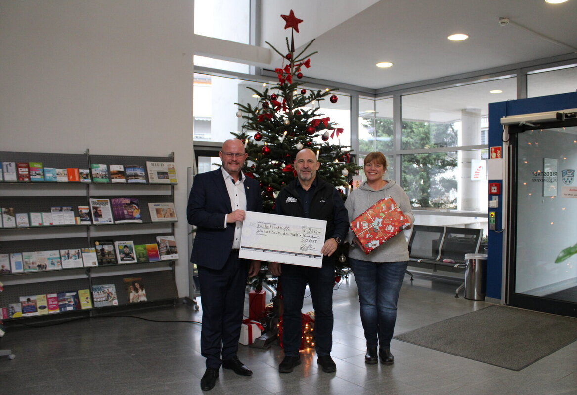 Die Wunschbaumaktion der Büchnerstadt Riedstadt wird in diesem Jahr auch von der Funke Kunststoffe GmbH, Niederlassung Heiligkreuzsteinach, unterstützt. „Statt Weihnachtspräsenten unterstützen wir immer ein soziales Projekt in der Region. Im letzten Jahr kam die Spende dem Frauenhaus Darmstadt zugute, in diesem Jahr haben wir uns für die Wunschbaumaktion in Riedstadt entschieden“, erklärte Ralph Mayer von Funke Kunststoffe bei der symbolischen Scheckübergabe über einen Betrag von 250 Euro an Bürgermeister Marcus Kretschmann und Personalratsvorsitzende Tanja Demuth, die Wunschbaumaktion im Rathaus koordiniert.