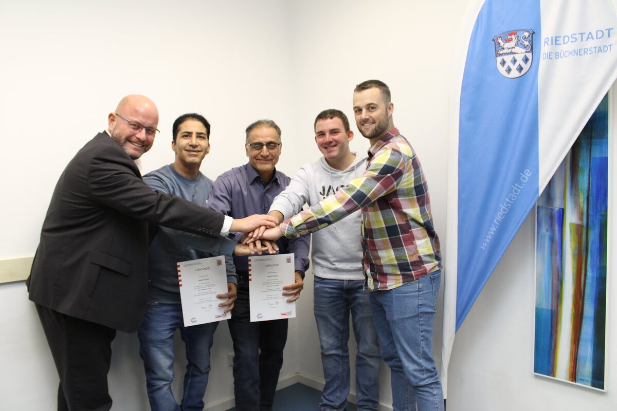 Die Büchnerstadt Riedstadt hat drei Sport-Coaches, die ehrenamtlich bei der Koordination der Angebote Riedstädter Sportvereine für und mit Geflüchteten, Menschen mit Migrationshintergrund sowie sozial benachteiligten Menschen helfen. Bürgermeister Marcus Kretschmann und Fachbereichsleiter Kinder, Jugend und Soziales Rick Hölzer haben nun den Sport-Coaches Maher Al Gnem (SKG Erfelden) und Samer Chawaf (TV Erfelden) die Urkunden des Hessischen Ministeriums überreicht und sich für ihr großes Engagement bedankt. Dr. Eckhardt Stein (SKG Erfelden) war verhindert und bekommt seine Urkunde nachgereicht.