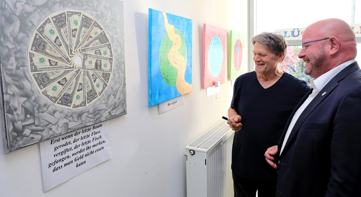 Eine bunte und vielfältige Ausstellung ist zurzeit in der Treppenhaus-Galerie des Rathauses zu sehen. Und das, obwohl alle Gemälde die gleiche geometrische Form zeigen. Zu sehen ist immer ein Kreis auf einem meist farbigen Hintergrund. Doch die Ausgestaltung ist höchst unterschiedlich. Mal strahlt zum Titel „Kinder an die Macht“ eine freche Pippi Langstrumpf aus einem knallbunten Kreis, mal schlängelt sich ein goldener Fluss durch das Rund, oder wird das ikonische Plattencover von Pink Floyds „The Dark Side of the Moon“ mit dem Lichtstrahl, der sich an einem Prisma bricht, in die runde Form gemalt.