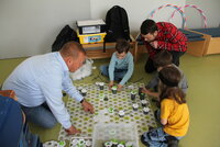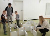 Die angehenden Schulkinder der Kita wurden in vier Gruppen aufgeteilt und erlebten im Laufe des Forschertages alle vier Stationen, die das MINT-Team eingerichtet hatte. Bei Okan Celikkol im Turnraum wurden hochkonzentriert nur mittels einer Fernbedienung immer komplizierte Steuerungsaufgaben gelöst. Mit großen Geschick steuerte Luis (sechs Jahre) nur mittels vierer Richtungspfeile ein Fahrzeug durch das Labyrinth. „Das ist ein super Ergebnis“, war Okan begeistert, als Luca (sechs) es schaffte, den mit einem Farbsensor ausgestatteten Roboter zu 40 Prozent auf dem roten Streifen fahren zu lassen. Die kompliziertes Aufgabe wartete am Schluss: Da galt es – wieder nur mit Hilfe einer Fernbedienung – mit den Greifwerkzeugen eines Fahrzeugs bunte Würfel in ein auf dem Boden aufgeklebtes Viereck zu bringen.