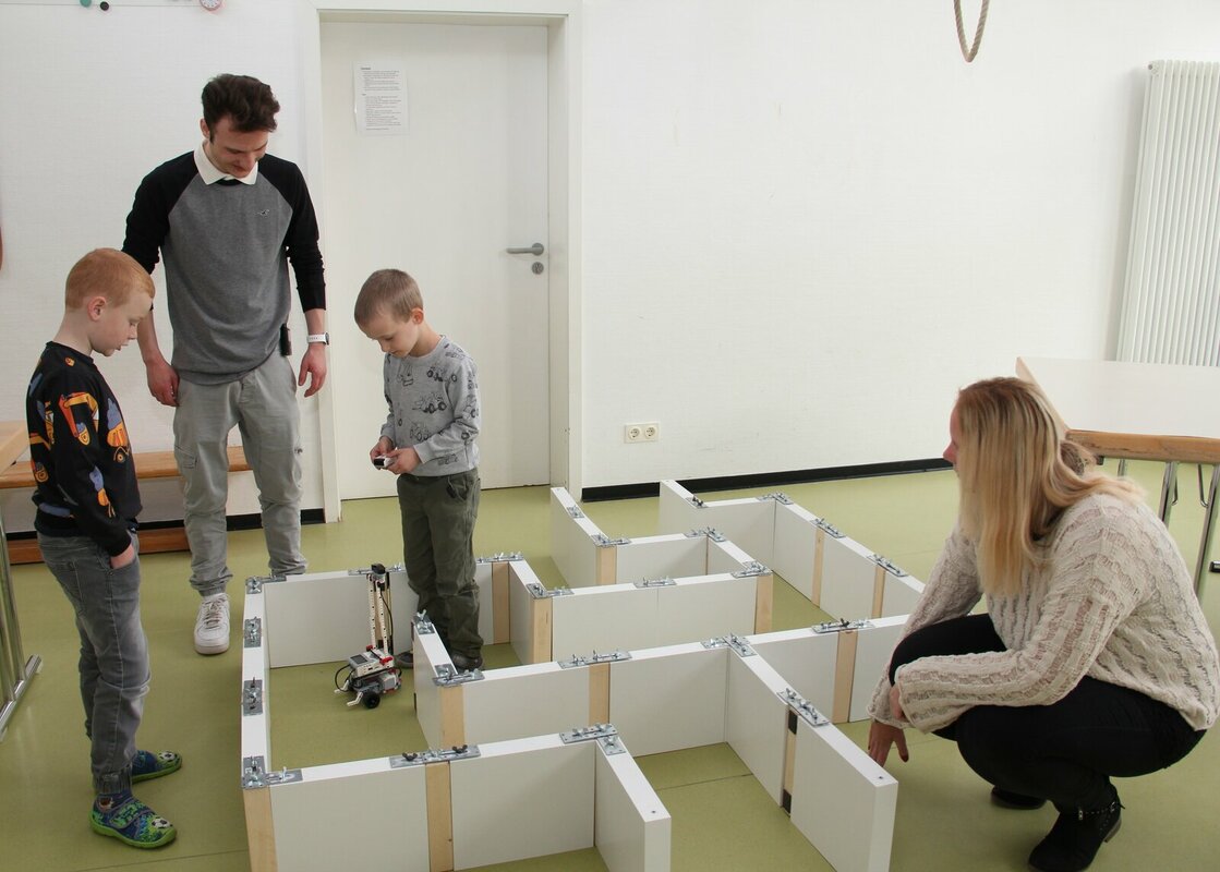 „Wisst ihr, warum wir heute hier sind?“, fragte Trautmann, Leiter der Fachoberschule der Beruflichen Schulen, bei denen das MINT-Zentrum untergebracht ist. „Wegen der Roboter!“, wusste Ben. Denn mit Argusaugen hatten die Kitakinder verfolgt, wie die beiden Informatikstudenten der Hochschule Rhein Main David Lerch und Okan Celikkol im Turnraum der Kita ein Labyrinth aufgebaut, Klebestreifen auf dem Boden aufgebracht und kompliziert aussehende Fahrzeuge startbereit gemacht hatten.